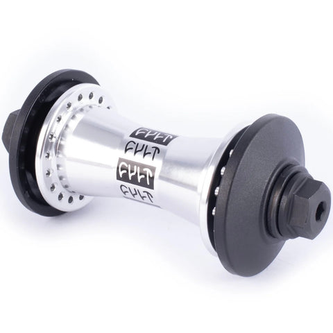 The Cult Crew front hub features a 6061 aluminum hub shell with sealed bearings, female axle w/ 3/8" chromoly axle bolts, and press fit collars with a pair of nylon hub guards